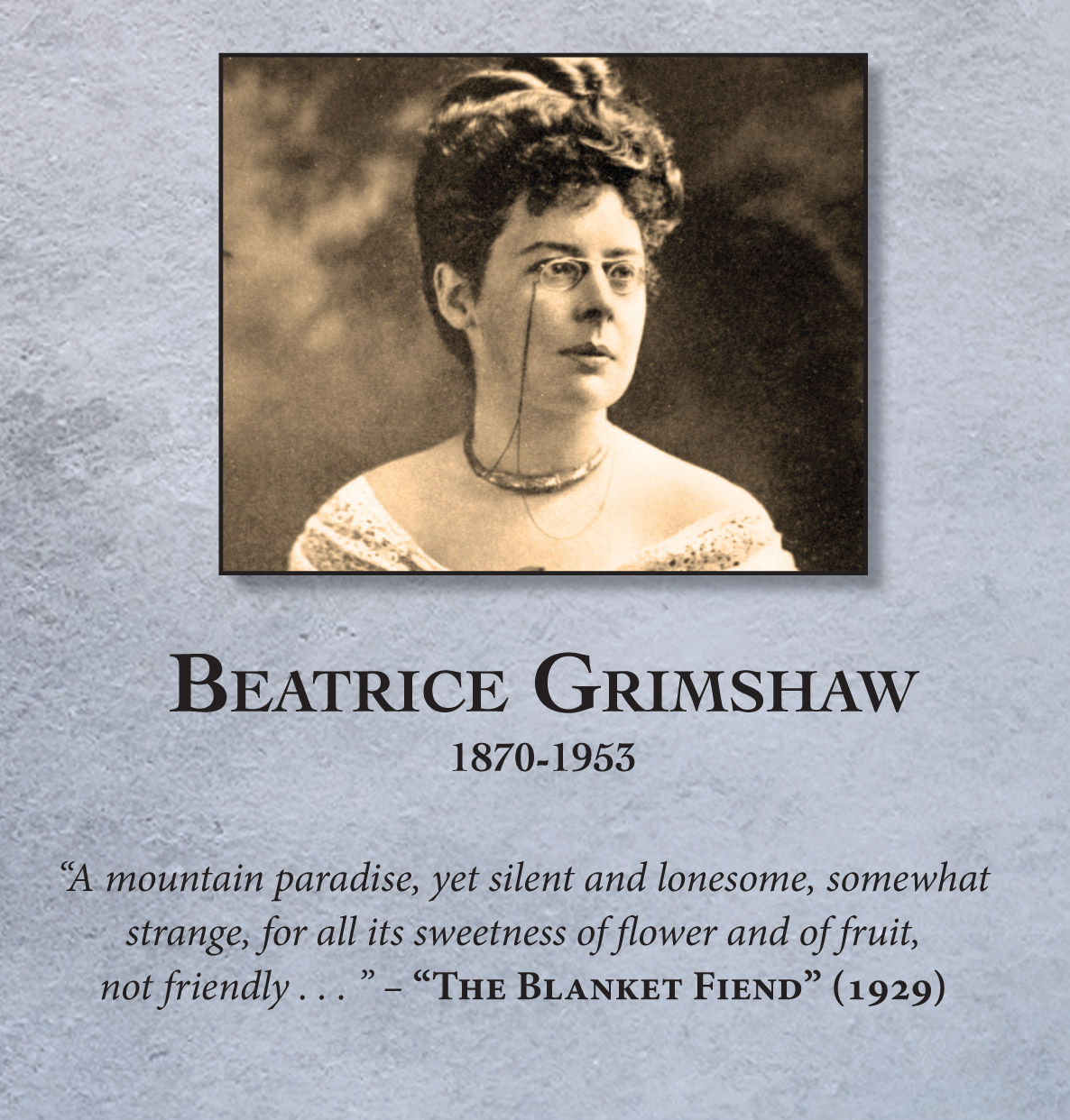 Although she was born in Ireland and lived and worked in many parts of the world, it was her close association with New Guinea for which Beatrice Grimshaw (1871-1953) is best remembered.