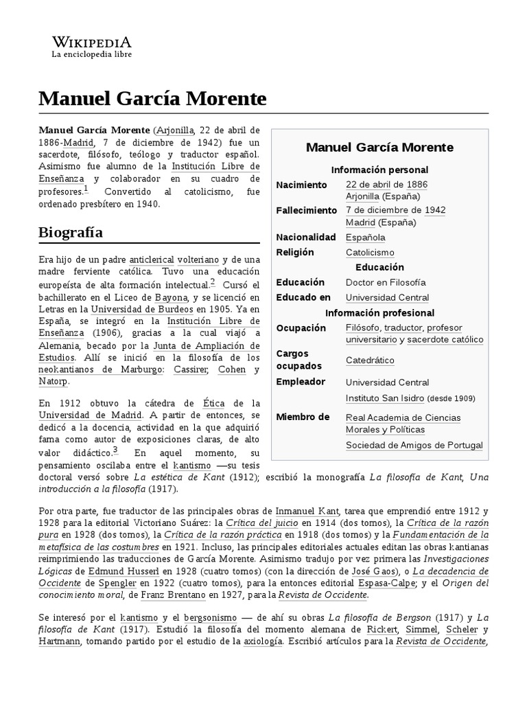 Antes de licenciarse en Filosofía y Letras por la Universidad de la Sorbona, el joven Manuel García Morente quedó también deslumbrado por el pensamiento de Bergson, el "filósofo de la intuición", cuya obra marcó decisivamente los primeros pasos de la especulación filosófica del intelectual jiennense. Marchó luego a Alemania para ampliar allí sus ya vastos conocimientos y, tras pasar por diversos centros superiores de Berlín y Munich, recaló en Marburgo y quedó allí fascinado por la escuela neokantiana que se había formado en su universidad, integrada por algunas figuras tan relevantes como Hermann Cohen, Paul Natorp y Ernst Cassirer. Estos tres ilustres maestros de neokantismo fueron también determinantes en la formación filosófica del joven García Morente, quien precisamente eligió uno de los aspectos más estudiados por su escuela como tema de su tesis doctoral.